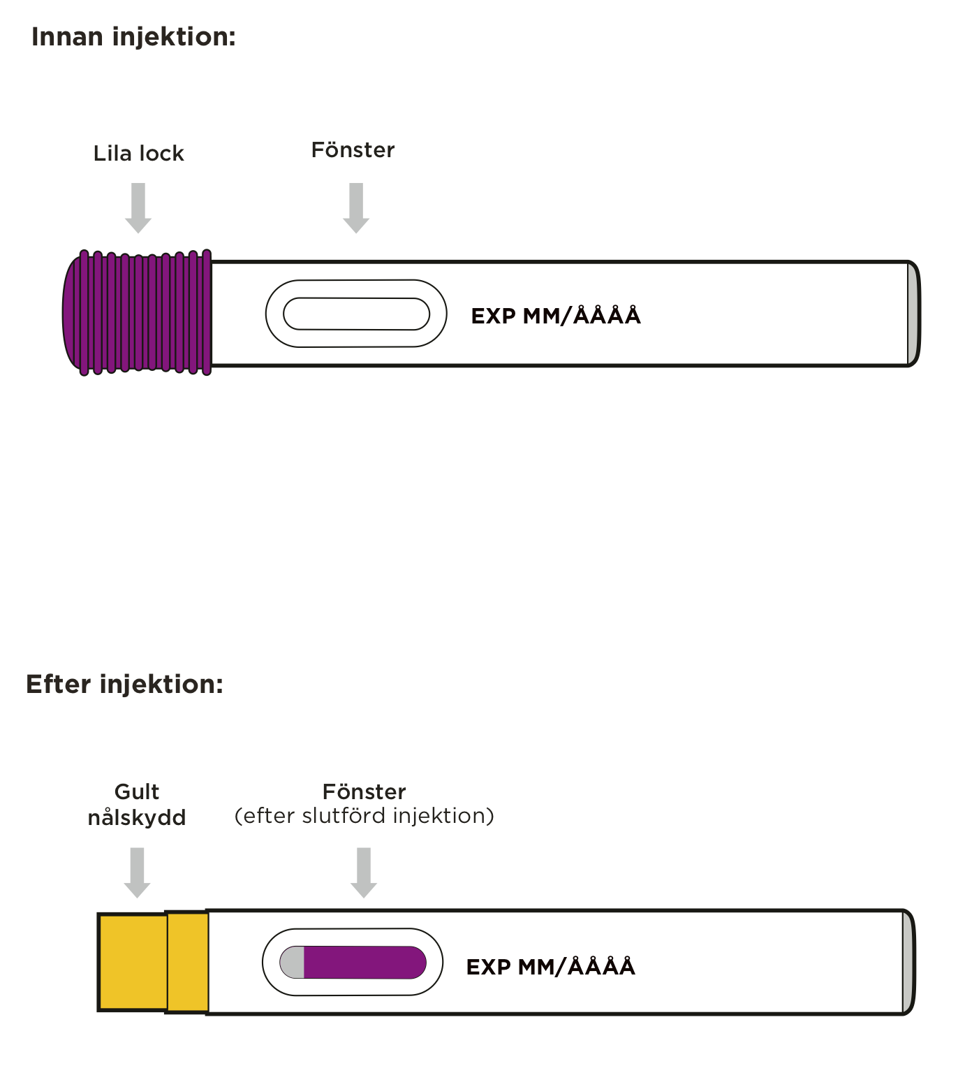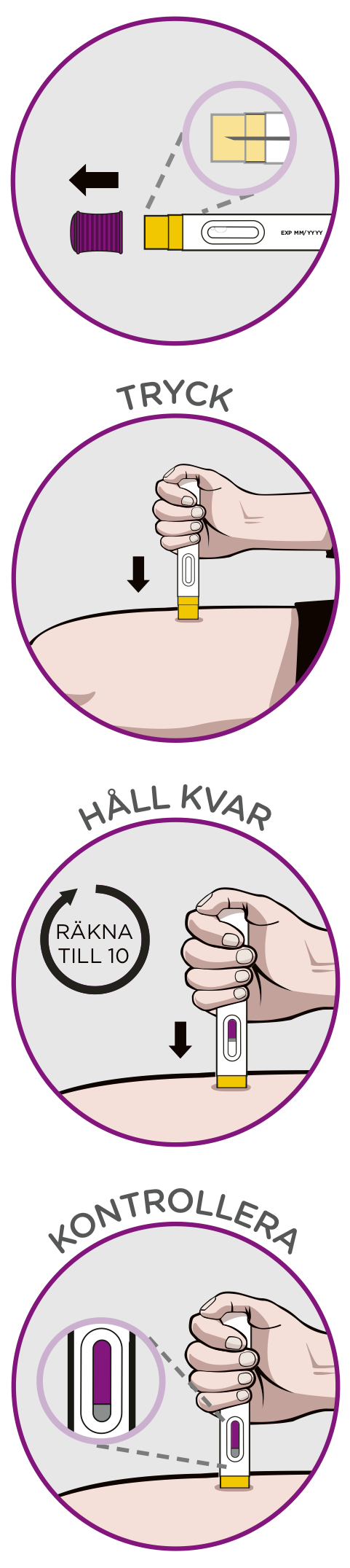 - Kontrollera att fönstret är lila innan du slutar att trycka injektionspennan mot huden.